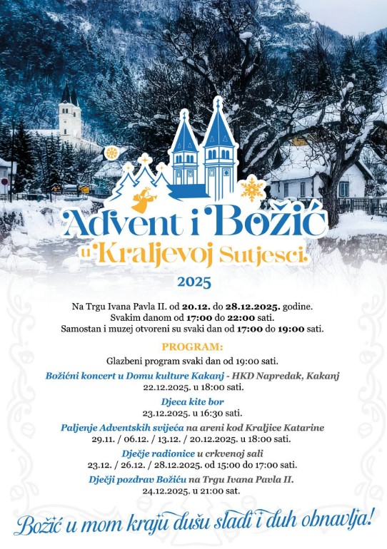 Svečanim paljenjem četvrte adventske svijeće u subotu, 20.12.2025.g, na Trgu pape Ivana Pavla II, otvorena je manifestacija „Advent i Božić u Kraljevoj Sutjesci“, čime započinje niz prazničnih događanja u ovom hisotrijskom mjestu.