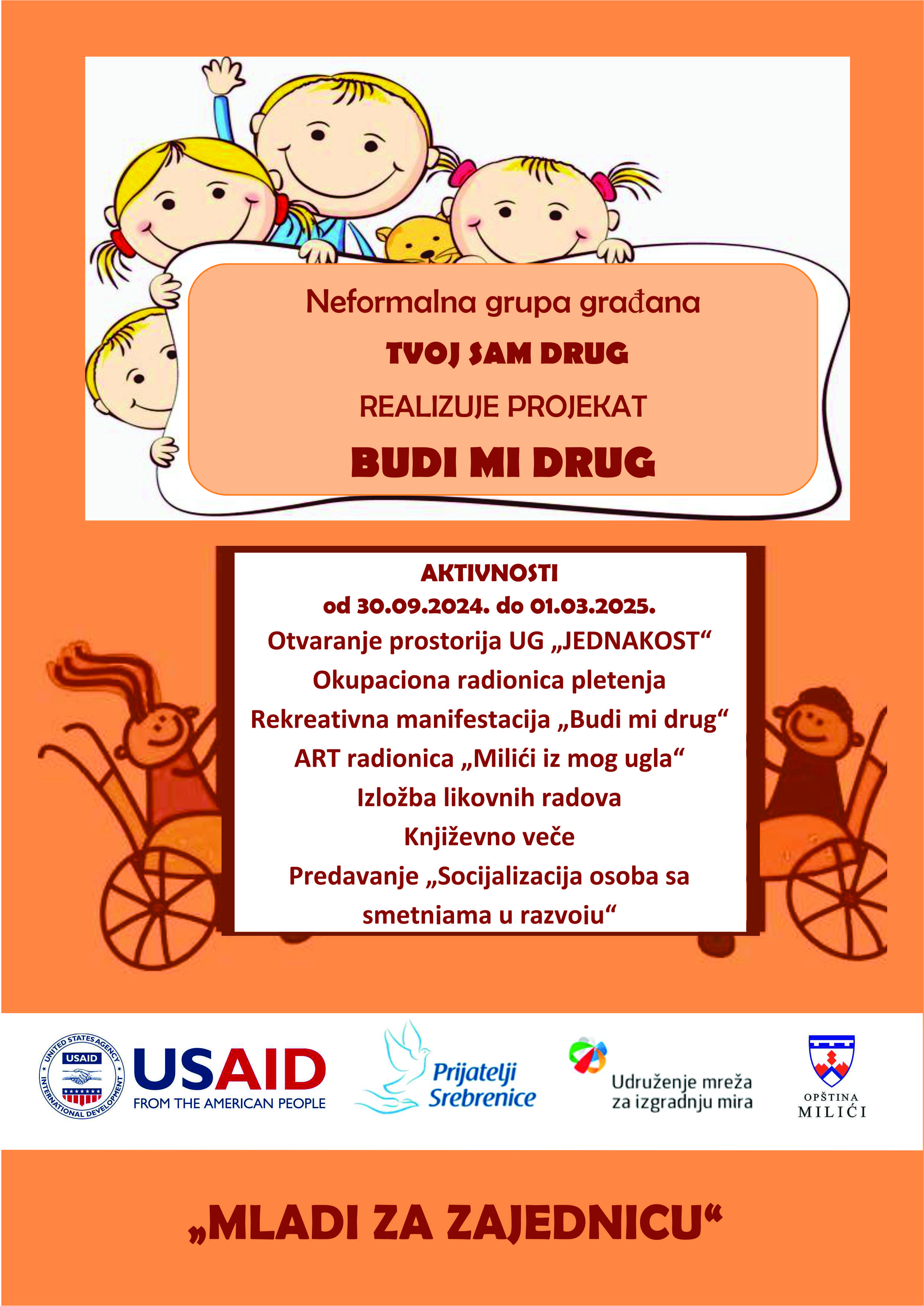 “BUDI MI DRUG“ koji teži da doprinese integraciji osoba sa invaliditetom i smetnjama u razvoju u život lokalne zajednice, kao i poboljšanju kvaliteta života ovih osoba.