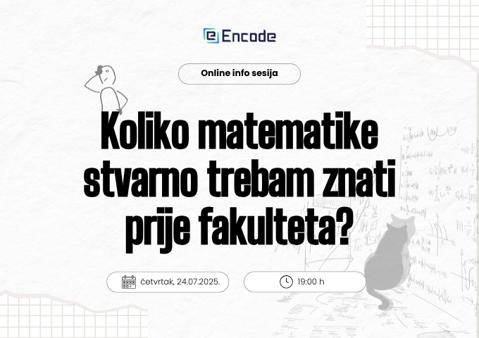 „Koliko treba da znam matematike prije faksa?“ Jedno od najčešće postavljenih pitanja – ali i jedno na koje rijetko ko daje konkretan odgovor. Zato organizujemo besplatnu online info sesiju za sve brucoše i srednjoškolce koji planiraju da upišu tehničke ili prirodne fakultete, a nisu sigurni koliko su zaista spremni za ono što ih čeka. ● Datum: Utorak, 24.7.2025. ● Vrijeme: 19:00 – 20:30 h ● Mjesto: Online (link se dobija nakon prijave)