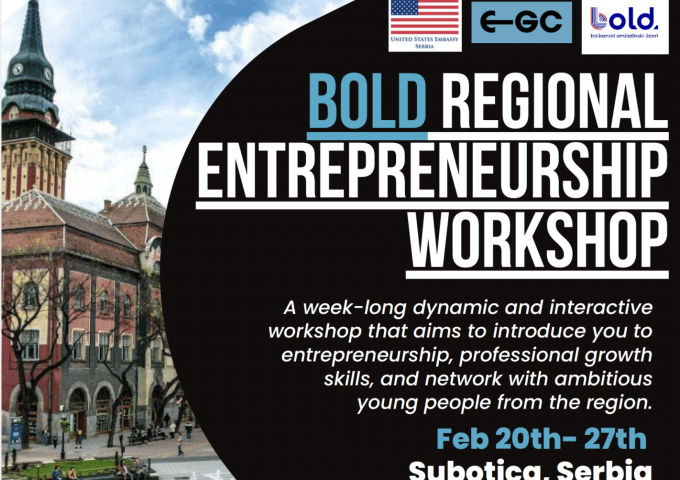 Subotica, Srbija – Sa ponosom najavljujemo jedinstvenu priliku za mlade preduzetnike iz regiona – BOLD Regionalnu Radionicu Preduzetništva, koja će se održati od 20. do 27. februara u Subotici, Srbija. Ova dinamična i interaktivna radionica održava se uz podršku Ambasade Sjedinjenih Američkih Država u Srbiji.