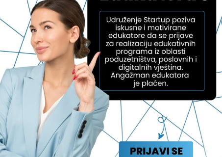 Udruženje Startup poziva iskusne i motivirane edukatore da se prijave za realizaciju edukativnih programa iz oblasti poduzetništva, poslovnih i digitalnih vještina. Angažman edukatora je plaćen.
