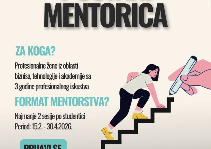 • Mentorstvo podrazumijeva minimalno dvije mentorske sesije sa dodijeljenom studenticom u periodu od 15. februara do 30.04.2026. godine, sa mogućnošću mentorstva za više studentica u skladu sa raspoloživošću.