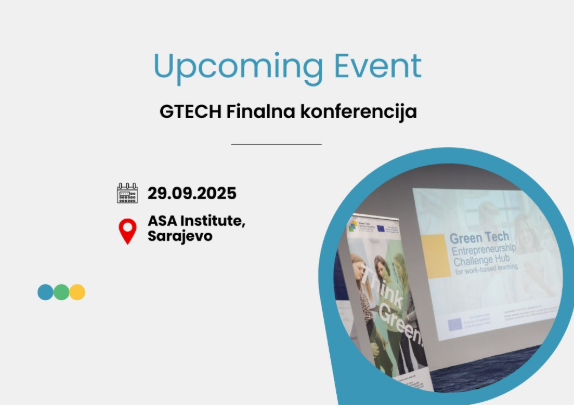 Pridružite nam se na završnoj konferenciji Erasmus+ projekta GTECH – Green Tech Entrepreneurship Challenge Hub, gdje ćemo predstaviti kako smo zajedno sa partnerima jačali kapacitete stručnih škola, podsticali inovacije i promovisali preduzetništvo i zelene tehnologije među mladima u Bosni i Hercegovini.