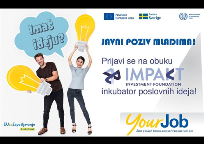 Caritas Bosne i Hercegovine i Socijalno-edukativni centar, u partnerstvu s Impakt Fondacijom, u okviru projekta Potpora zapošljivosti i mogućnostima zapošljavanja mladih – Your Job, a koji se provodi u okviru projekta EUzaZapošljavanje uz podršku Europske unije i Švedske, i kojeg realizira Međunarodna organizacija rada u BiH, poziva sve zainteresirane nezaposlene mlade u dobi od 18-29 godina da se prijave za sudjelovanje na obuci Inkubator poslovnih ideja. Obuka podrazumijeva predavanja i mentorstvo o ključnim elementima poslovnog dizajna/modeliranja.
