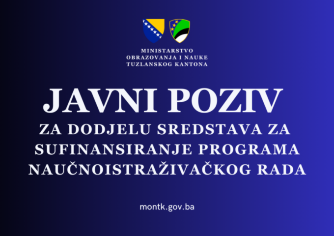 Ministarstvo obrazovanja i nauke Tuzlanskog kantona objavljuje javne pozive za dodjelu sredstava iz Budžeta Tuzlanskog kantona za 2026. godinu, sa ciljem unapređenja naučnoistraživačke djelatnosti, razvoja istraživačkih kapaciteta i jačanja saradnje između akademske zajednice, institucija i društva u cjelini. Javni pozivi obuhvataju finansiranje i sufinansiranje sljedećih programa: