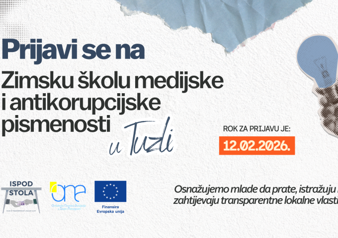 Ako te zanima kako funkcioniše lokalna vlast u mjestu u kojiem živiš, ako želiš naučiti kako pratiti odluke lokalnih vlasti ili te privlači ideja da tvoj tekst ili infografika budu objavljeni – onda je ovo prilika koju ne želiš propustiti. Omladinska novinska asocijacija u BiH, kroz projekat „Ispod stola“, pokreće Zimsku školu medijske i antikorupcijske pismenosti u Tuzli – edukativni program koji okuplja mlade iz različitih dijelova BiH i osnažuje ih da razumiju, prate i javno propituju rad lokalnih vlasti. Radi se o praktičnom, dinamičnom i mentorskom programu namijenjenom mladima koji žele učiti, postavljati pitanja i napraviti svoje prve korake u kreiranju medijskih sadržaja o transparentnosti, radu općinskih i gradskih vijeća te donošenju odluka koje direktno utiču na građane.