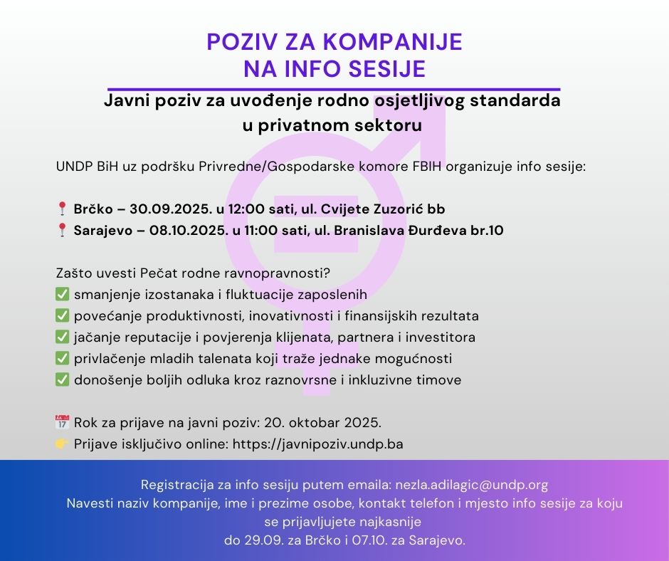 Javni poziv za uvođenje rodno osjetljivog standarda u privatnom sektoru otvoren je 10. septembra 2025. godine. Kako bismo kompanijama približili detalje i proces uvođenja Pečata rodne ravnopravnosti, UNDP BiH uz podršku Privredna/Gospodarska komora FBIH organizuje info sesije: 📍 Brčko – 30.09.2025. u 12:00 sati, ul. Cvijete Zuzorić bb