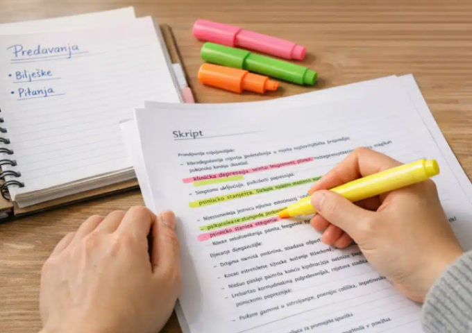 Praktičan savjet je kombinovati čitanje sa aktivnim označavanjem. Nije potrebno podvlačiti sve, već samo ono što se ponavlja na ispitima ili što profesor posebno naglašava. Tako skripta vremenom postaje personalizirani vodič za učenje, a ne samo statičan dokument.