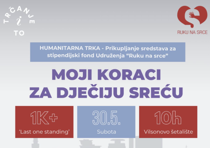 🥰 Udruženje “Ruku na srce” i Trčanje i to i ove godine organizuju humanitarnu trku “Moji koraci za dječiju sreću” čiji je cilj prikupljanje sredstava za stipendiranje djece i mladih iz porodica slabijeg materijalnog stanja.