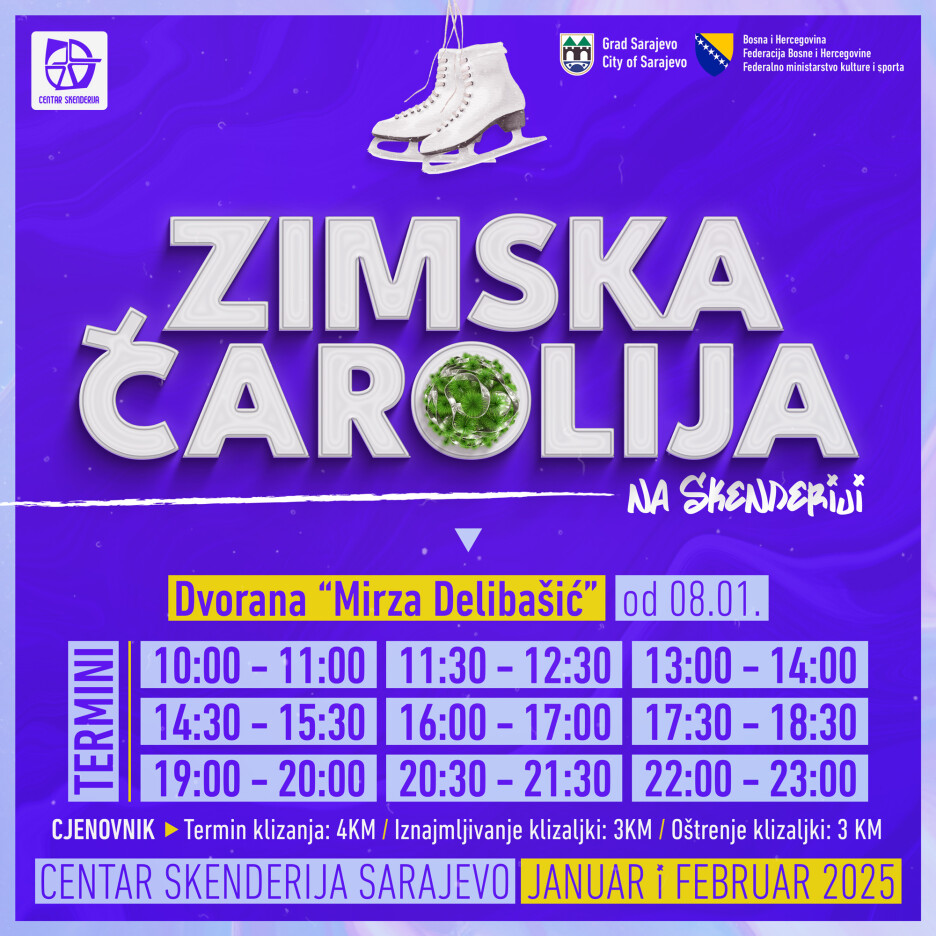 Pogledajte termine i cijene ulaznica za “Zimsku čaroliju” u priloženom vizualu! Više informacija možete pronaći i na facebook stranici (facebook.com/klizalisteskenderija), web stranici Centra Skenderija (www.skenderija.ba), kao i na ostalim linkovima Centra Skenderija na društvenim mrežama.