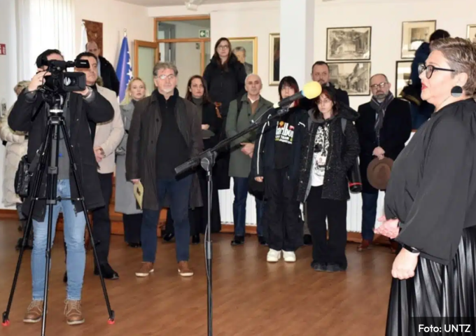 Izložbu je otvorila prof. dr. Vesna Bratovčić, prorektorica za međunarodnu saradnju u zemlji i inostranstvu Univerziteta u Tuzli, naglasivši posebnu važnost svih autora čija umjetnička djela Univerzitet posjeduje, te da se otvorila mogućnost da i šira društvena javnost ima priliku pogledati umjetničke radove do 10. marta ove godine.