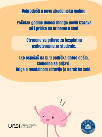 Obavještavamo vas da svi studenti Univerziteta u Sarajevu imaju mogućnost da pristupe besplatnoj psihoterapiji i psihološkom savjetovanju.