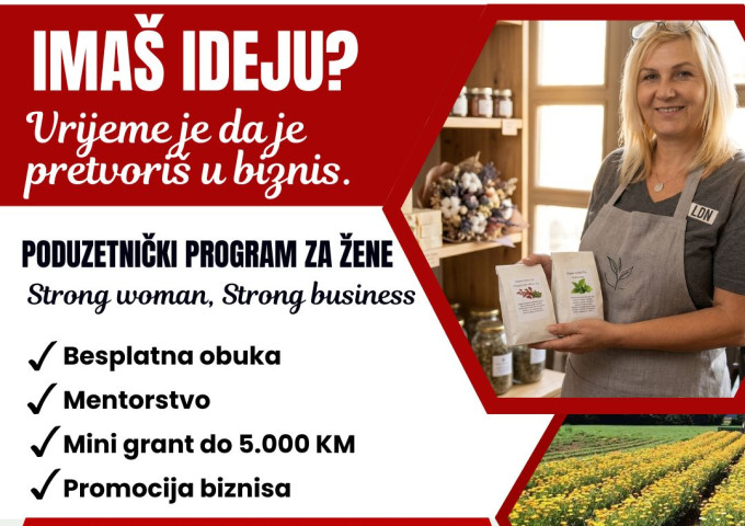 Program “Strong Woman, Strong Business” namijenjen je ženama sa područja Zeničko-dobojskog kantona koje imaju poslovnu ideju i žele napraviti prve korake u poduzetništvu. Rok za prijavu na program: 27.4.2026. Prijave izvršiti preko forme: https://forms.gle/hj76GnRcixtwJyhTA