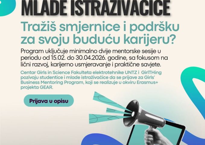 Tražite podršku, savjete i smjernice za svoju buduću karijeru? Centar za djevojke u nauci, Elektrotehnički fakultet, Univerzitet u Tuzli, u saradnji sa Udruženjem GirlHing poziva studentice i istraživačice da se prijave za učešće u Programu mentorstva za djevojke u biznisu, koji se provodi u okviru Erasmus+ GEAR projekta.