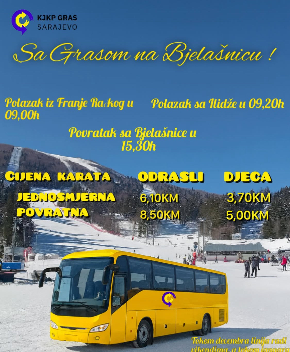 Linija 44 Franje Račkog - Ilidža -Bjelašnica radit će svakog vikenda u Decembru i svakog dana u Januaru 2026.godine.