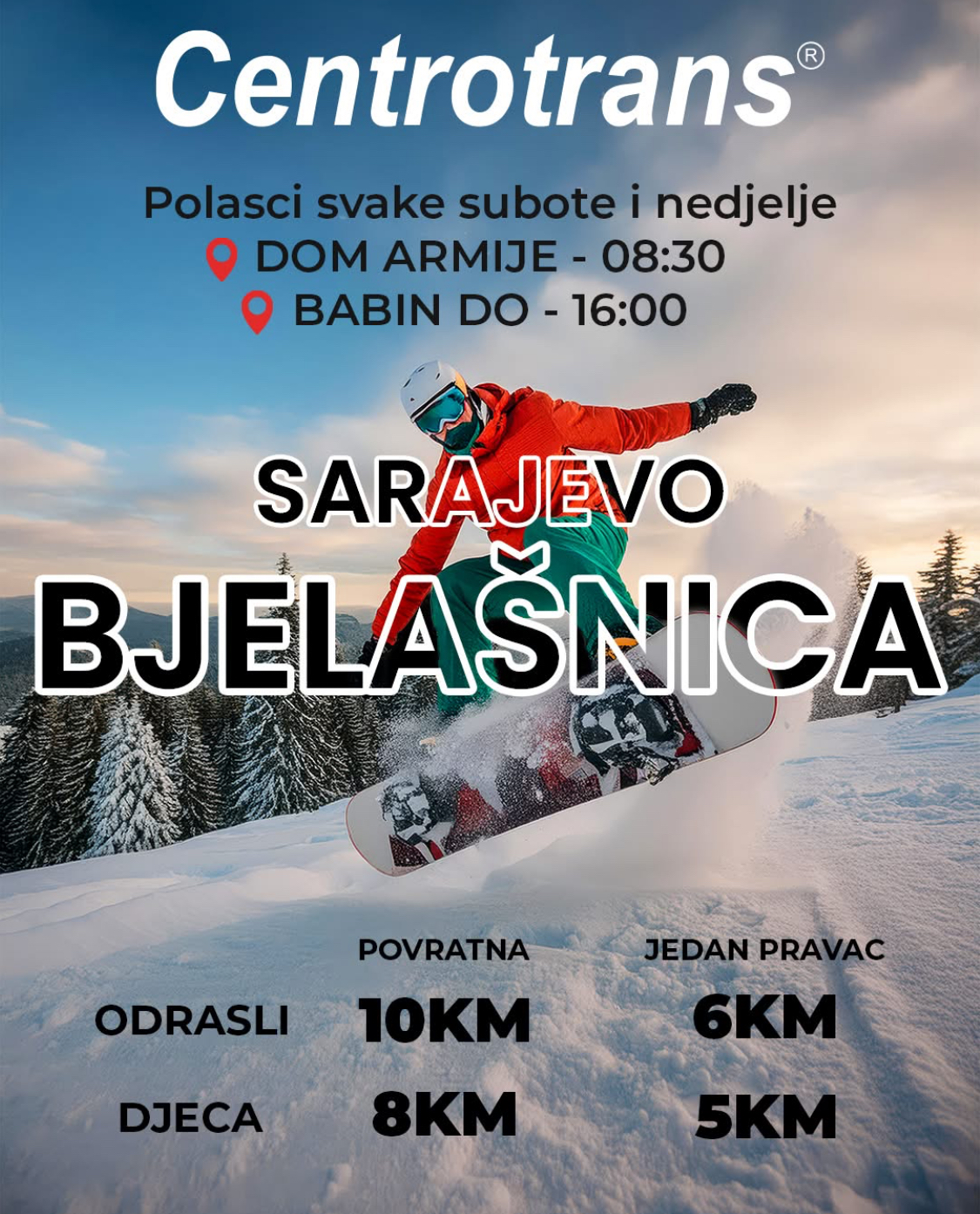 🚍 Dom Armije (8:30h) - Babin Do, Bjelašnica (16:00h), uz usputna stajališta: