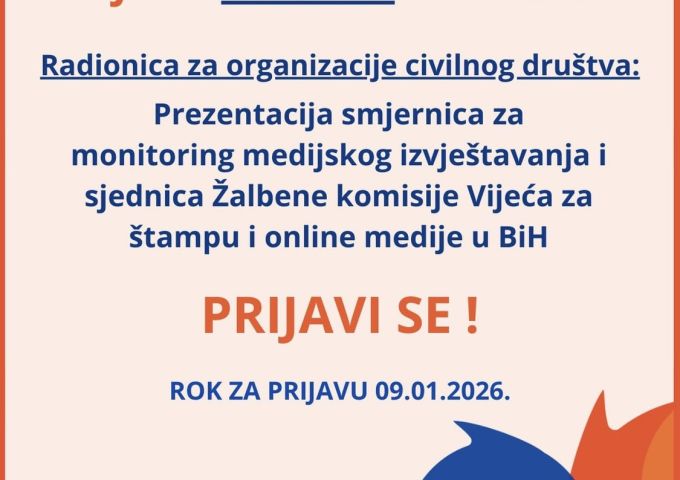 Ovo je prilika da se organizacije civilnog društva upoznaju sa mogućnostima žalbi na neprofesionalno medijsko izvještavanje. Na radionici će biti prezentovane smjernice za monitoring medijskog izvještavanja koje su razvijene u okviru projekta. Također, bit će održana sjednica Žalbene komisije Vijeća za štampu i online medije u BiH kako bi prisutni dobili uvid žalbeni proces.