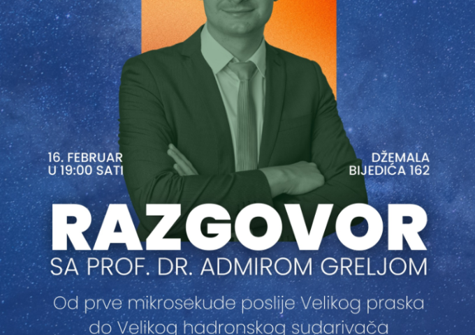 Šta povezuje veliki prasak sa Velikim hadronskim sudarivačem? Zanima vas kako istraživači ispituju nastanak svemira? Dođite i saznajte odgovore na ova i druga pitanja u razgovoru sa prof. dr. Admirom Greljom pod nazivom "Od prve mikrosekude poslije Velikog praska do Velikog hadronskog sudarivača".