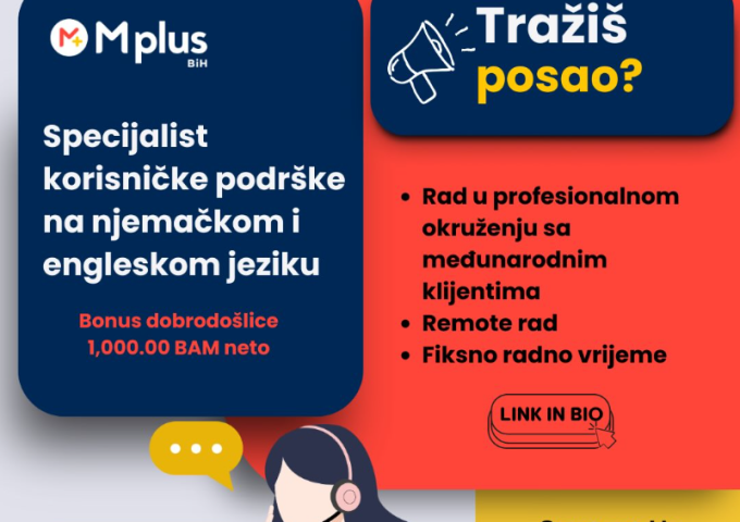 Tražiš stabilan posao u profesionalnom i međunarodnom okruženju? Mplus BiH zapošljava Specijalist korisničke podrške za rad sa klijentima na njemačkom i engleskom jeziku.
