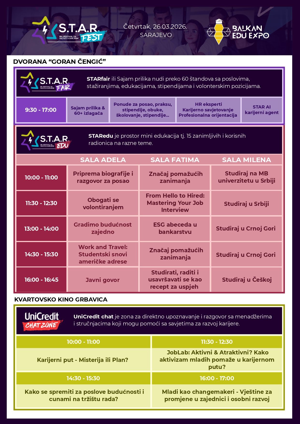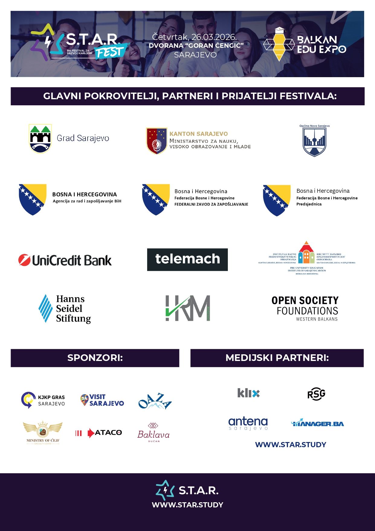 Peto izdanje STARfesta, najvećeg događaja za razvoj karijere mladih u Bosni i Hercegovini, bit će održano u Sarajevu u četvrtak, 26. marta 2026. godine. Ovaj jedinstveni festival okupit će više od 3.000 mladih iz cijele zemlje s ciljem da ih informira o trendovima na tržištu rada, poslovima budućnosti, mogućnostima daljeg obrazovanja, ali i konkretnim načinima kako da se što bolje pripreme za prelazak iz školskih klupa u svijet rada. Ovogodišnji STARfest održava se u dvije dvorane na Grbavici. U dvorani „Goran Čengić“ bit će organiziran sajamski i edukativni program, gdje će mladi imati priliku da direktno razgovaraju s predstavnicima kompanija, poslodavcima i menadžerima iz različitih sektora. Među izlagačima su UniCredit Bank, Telemach, Raiffeisen Bank, Holdina, LIDL, Jumbo, ASA osiguranje, EKI, Sparkasse Bank, Strabag, BBI Bank i mnogi drugi.