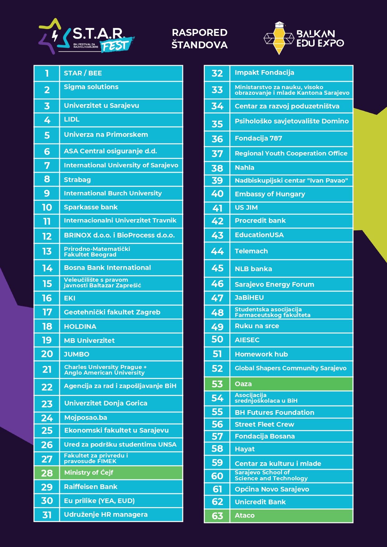 U partnerstvu s Balkan EDU Expo, posjetiteljima će se predstaviti i brojni univerziteti iz Bosne i Hercegovine, ali i iz obližnjih zemalja. Na festivalu će učestvovati i vodeće omladinske i nevladine organizacije, značajna karijerna savjetovališta, uz podršku Udruženja HR managera, MojPosao, Domino i Centra za razvoj poduzetništva.