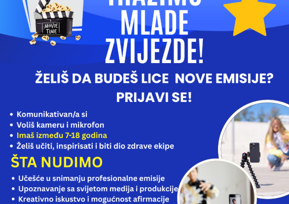 Tražimo djecu i mlade uzrasta 7–18 godina koji žele da budu ispred kamere i podijele svoj glas.