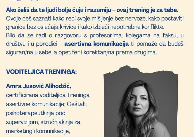 Dragi studenti i drage studentice, pozivamo vas da se prijavite na trening u tri modula: “Lakše na ispitima, bolje u odnosima – kroz ASERTIVNOST!” Trening vodi Amra Jusović Alihodžić, certificirana voditeljica Treninga asertivne komunikacije sa iskustvom u radu sa pojedincima i grupama; Geštalt psihoterapeutkinja pod supervizijom, stručnjakinja za marketing i komunikacije, COACH ICI, NLP Master. Trening oragnizuje Odjel za psihološko savjetovanje u okviru Ureda za podršku studentima Univerziteta u Sarajevu.