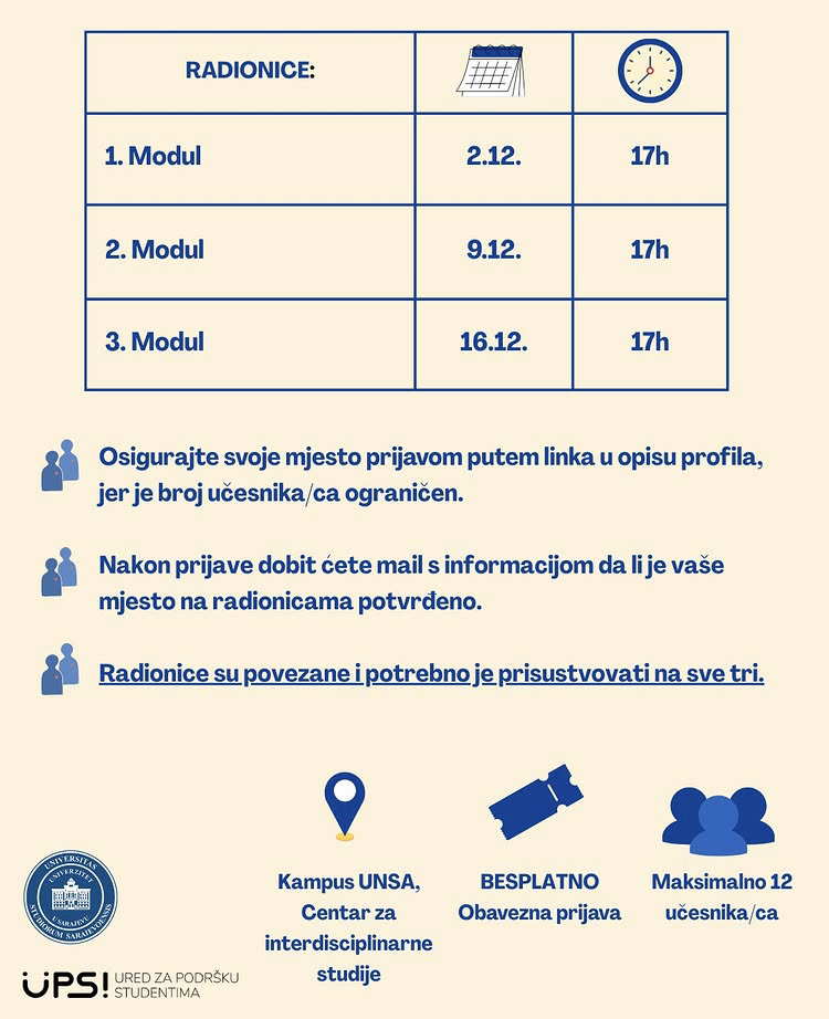 Broj mjesta je ograničen na grupu od 12 studenata/ica, prednost se daje studentima/icama prema datumu prijave. Preduslov za učešće je prisustvo svim modulima. Učešće je besplatno. Čekamo vas!