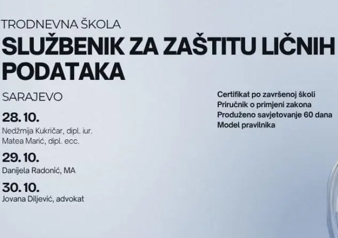 Od 28. do 30. oktobra 2025. godine u hotelu "Hollywood" u Sarajevu biće održana Trodnevna škola "Zaštita ličnih podataka", u organizaciji REC d.o.o.