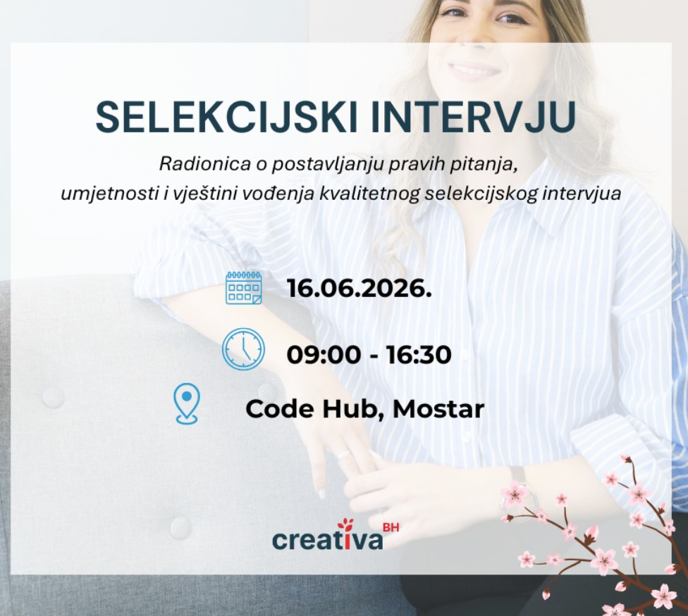 Druga radionica, Selekcijski intervju, održava se 16. 06. 2026. i namijenjena je svima koji žele unaprijediti način vođenja intervjua, bolje definirati kriterije zapošljavanja i donositi sigurnije odluke o kandidatima.