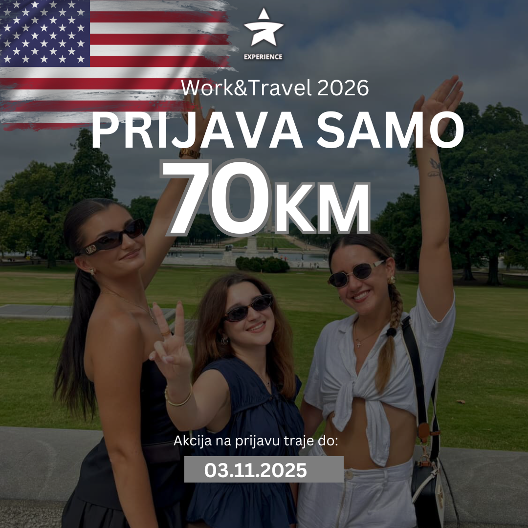 Iskoristi priliku i prijavi se za najpopularniji studentski program u BiH! 🌎 Work & Travel USA program ti omogućava da provedeš ljeto u Americi, radiš, putuješ i stekneš iskustvo koje ćeš pamtiti cijeli život. 💸 Samo do 3. novembra 2025. cijena prijave iznosi 70 KM umjesto 250 KM! Prijavu možeš obaviti online – brzo, jednostavno i bez dolaska u kancelariju.
