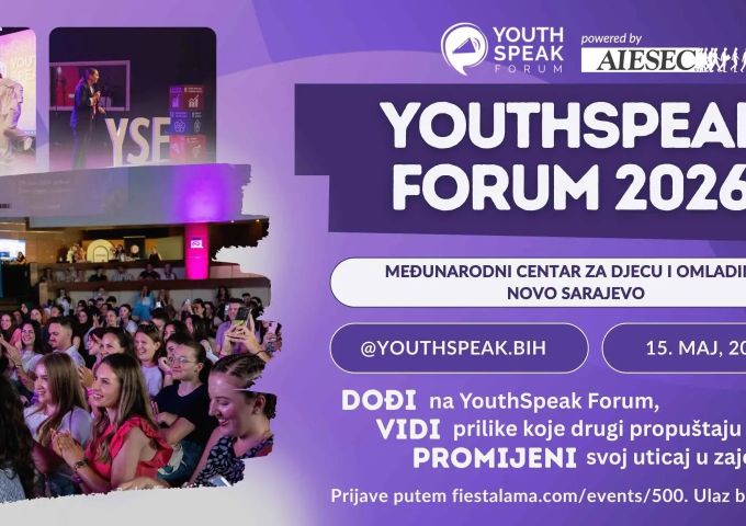 YouthSpeak Forum stiže u Sarajevo! U petak, 15. maja 2026. godine, u Međunarodnom centru za djecu i omladinu Novo Sarajevo, okupljamo mlade koji žele da se njihov glas čuje, da razmijene ideje i budu dio pozitivnih promjena u društvu.