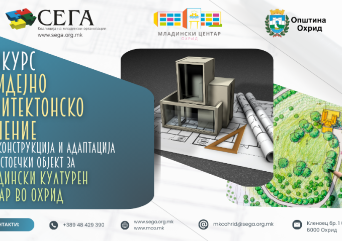 Коалиција на младински организации СЕГА, во рамки на Програмата на Младински Центар Охрид 2025–2026 (финансирана од Општина Охрид), распишува анонимен, национален, едностепен конкурс за изработка на идејно архитектонско решение за реконструкција и адаптација на постоечки објект во Младински културен центар во Охрид.
