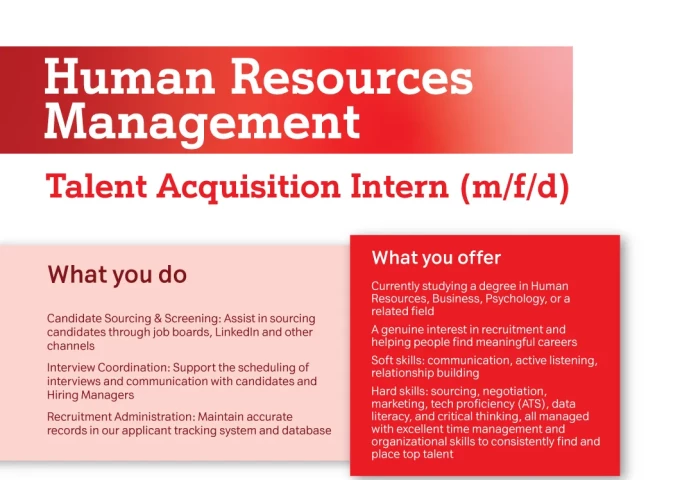 - Тврди вештини: пронаоѓање кандидати, преговарање, маркетинг, технолошка писменост (ATS), анализа на податоци и критичко размислување, со одлично управување со времето и организациски вештини за постојано пронаоѓање и ангажирање на врвни таленти.